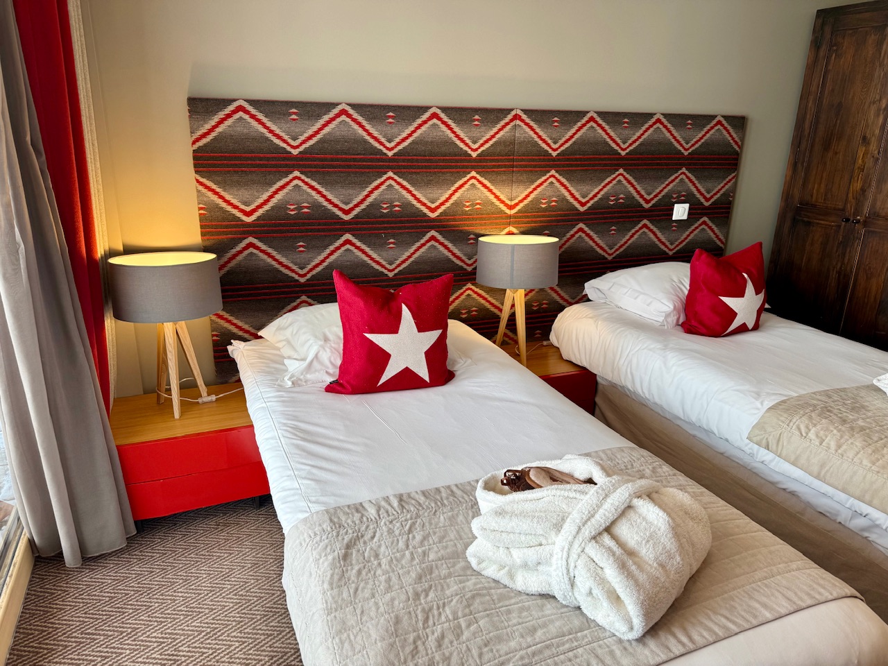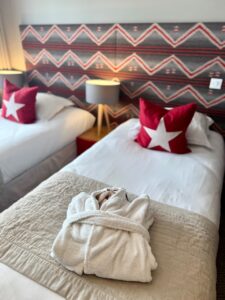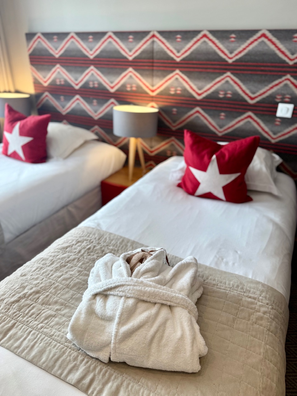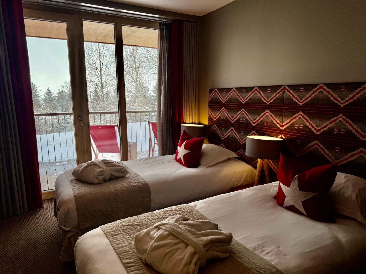 Pour ma part, je suis partie avec une copine et nous avions une chambre double avec des lits jumeaux ainsi qu’un balcon donnant sur les pistes. Très cosy, la chambre était confortable avec tout le nécessaire pour passer un bon séjour au ski. Notre casier à ski était juste en face de la chambre, tout comme l’accès aux pistes d’ailleurs.