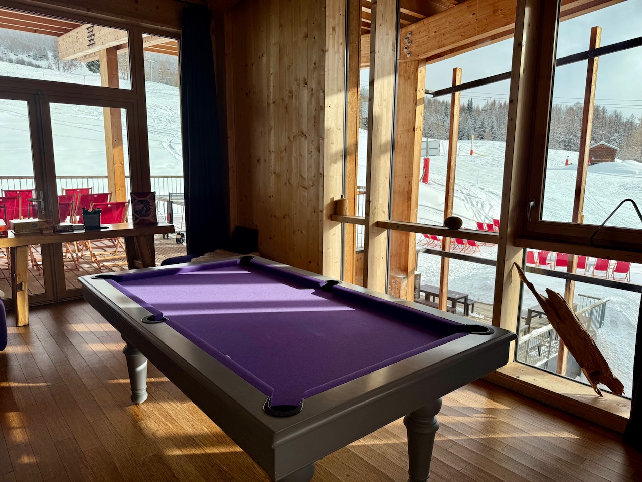 Le restaurant de l’Aiguille Grive fait partie des adresses que j’ai vraiment appréciées pendant mon séjour. Le midi, c’est très sympa de pouvoir déjeuner en terrasse directement sur les pistes. Puis le soir, c’est un vrai confort d’avoir une bonne table sur place. J’ai aimé le fait que l’on retrouve les spécialités savoyardes, tout en ayant aussi d’autres choix à la carte. Après le dîner, je vous invite à poursuivre la soirée au bar, au coin de la cheminée. On peut alors faire des jeux de société et même un billard. La déco du lieu est splendide.