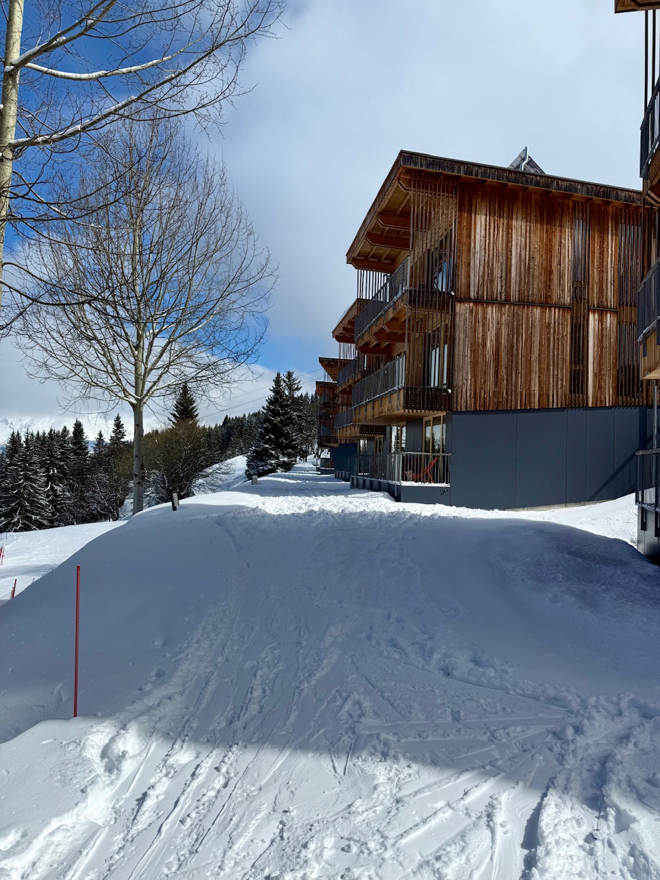 Cependant, même si l’établissement donne cette impression d’être isolé, il reste pratique pour rejoindre la station. En effet, le centre d’Arc 1800 se trouve à seulement 10 minutes à pied. Cela permet donc de profiter à la fois du calme et de la proximité avec les commodités. De même, l’accès et le retour ski aux pieds sont vraiment très appréciables.